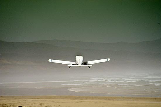 Raymond flies off over a hazy beach and huge waves