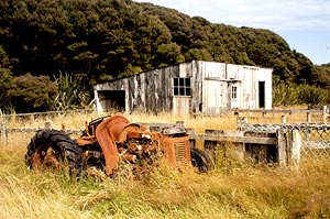 Schafstall steht noch, ebenso der rostige Traktor und das ehemalige